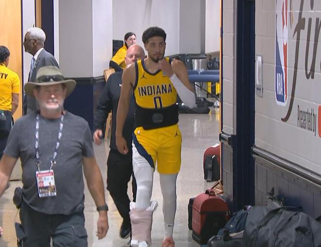 可是哈利伯顿的这个得分账户始终就没有打开,一直到第3节打到还有7分07秒的时候,哈利伯顿终于靠着罚球拿到了本场比赛的第1分。而且中场休息时,他的右腿已经缠上冰袋了,好像是出现了伤病的情况。